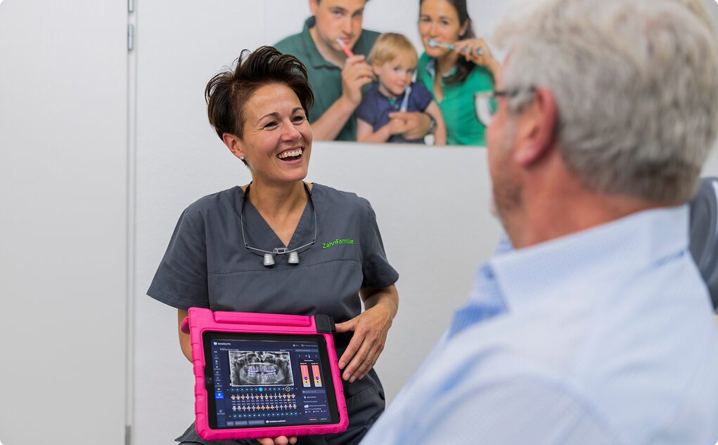 Unsere Zahnärztinnen sind zusätzlich in der Kinderzahnheilkunde geschult und verbinden moderne Technik mit viel Empathie – von der 3D-gestützten Diagnostik über KI-unterstützte Planung bis hin zu individueller Nachsorge. Mit eigenem Zahnlabor und innovativer Parodontologie sichern wir höchste Präzision, Qualität und Nachhaltigkeit.